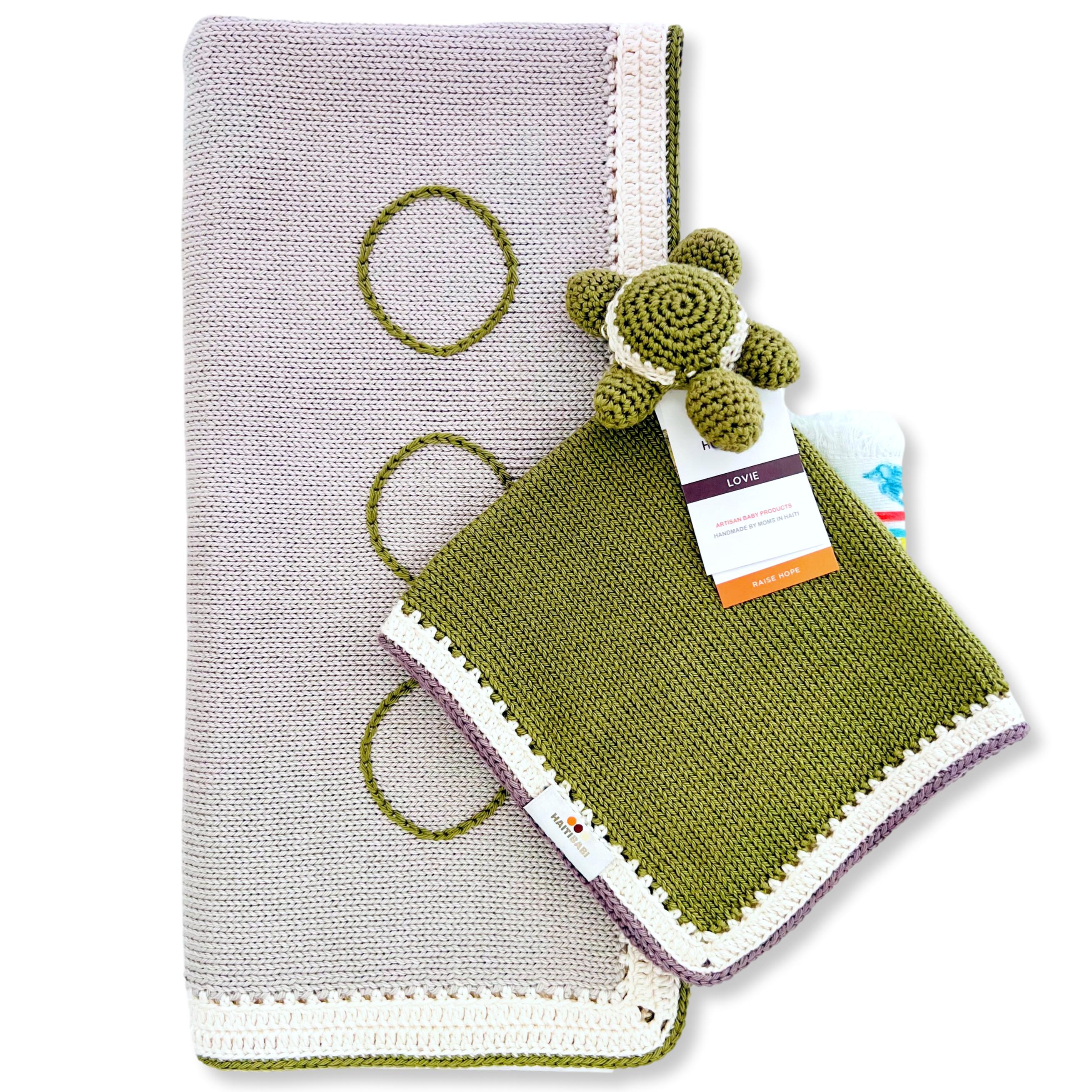 Each blanket and lovie is hand-knit and crocheted by moms in Haiti using premium, all-natural Ultra Pima Cotton. The luxuriously soft yarn is gentle against baby’s skin, won’t pill over time, and creates the perfect balance of warmth and breathability thanks to its unique knit texture.
