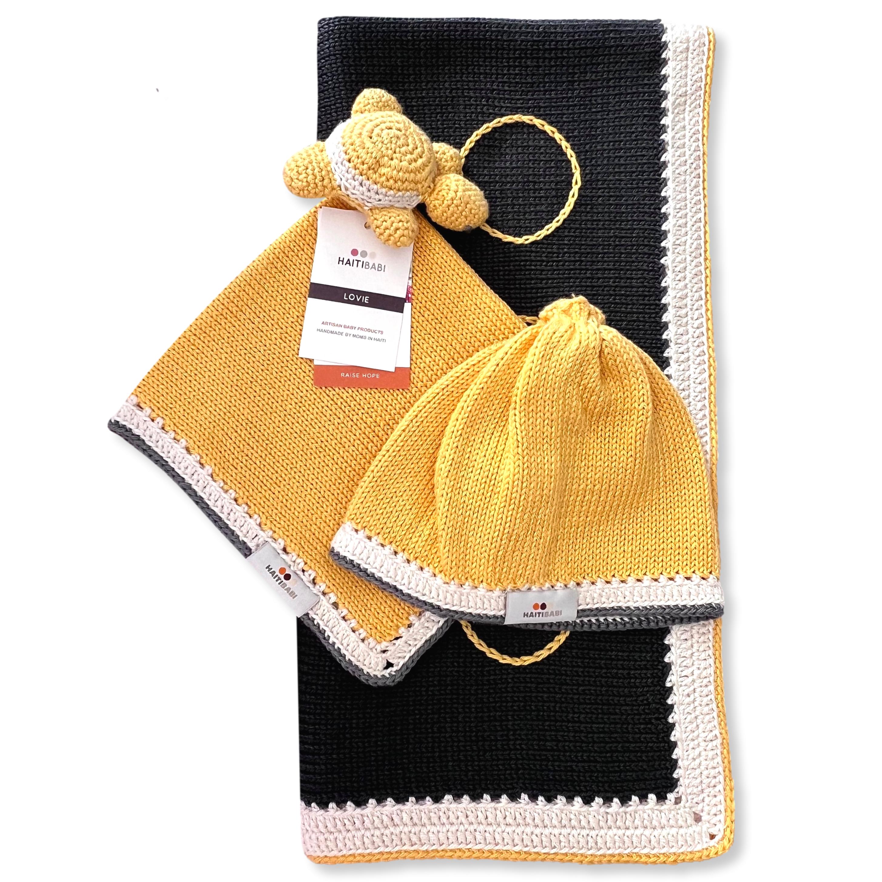 Each Blanket, Lovie, and Beanie is lovingly hand-knit and crocheted by moms in Haiti using premium, all-natural Ultra Pima Cotton. The luxuriously soft yarn is gentle against baby’s delicate skin, won’t pill over time, and provides the perfect balance of warmth and breathability thanks to its unique knit texture.