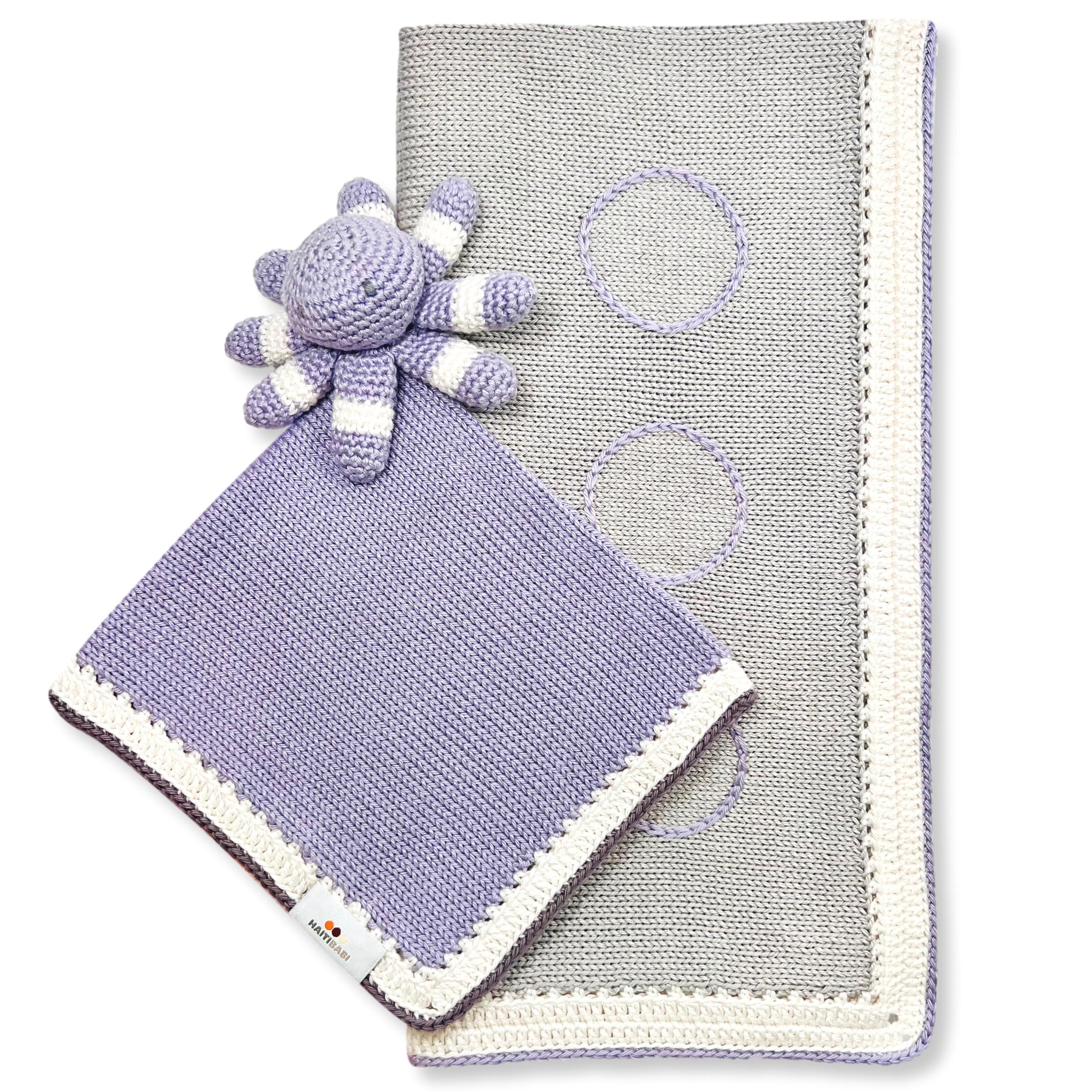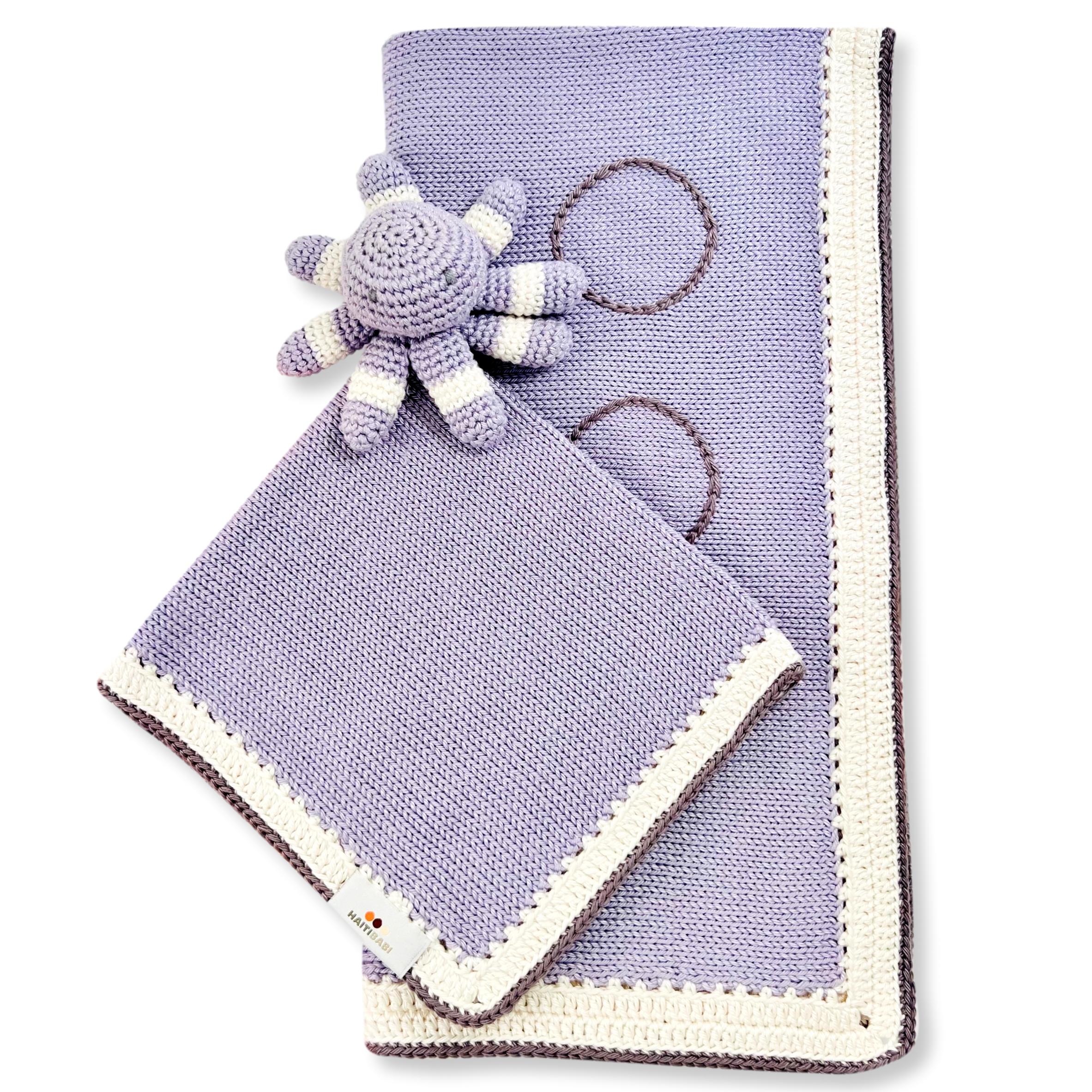 Wrap your little one in coziness with our Purple Ice Baby Blanket and Octopus Lovie Set, beautifully accented with a Natural Shell Border and Suede Trim. Soft, breathable, and machine washable, this duo is designed to keep baby feeling warm, soothed, and secure.