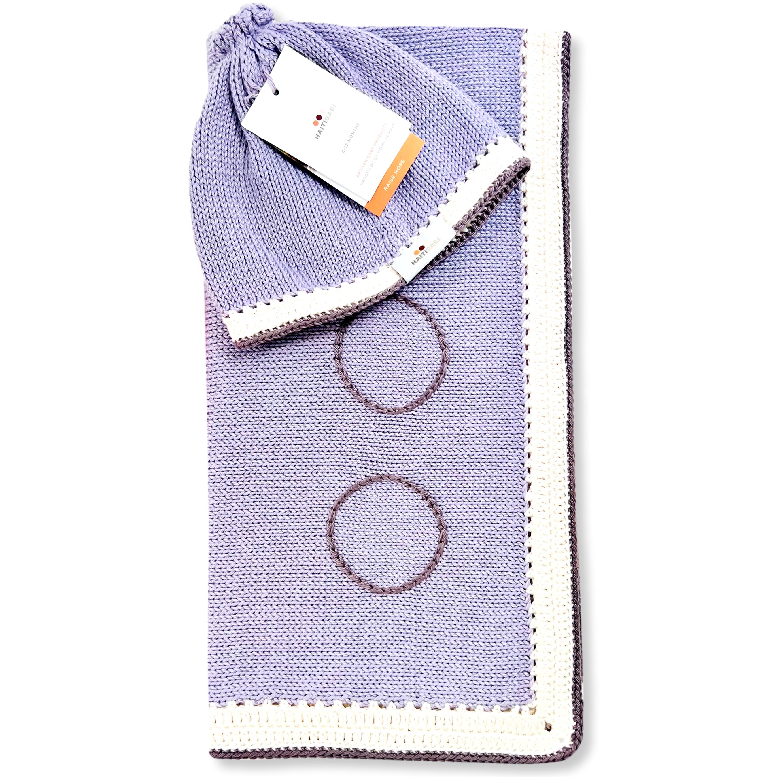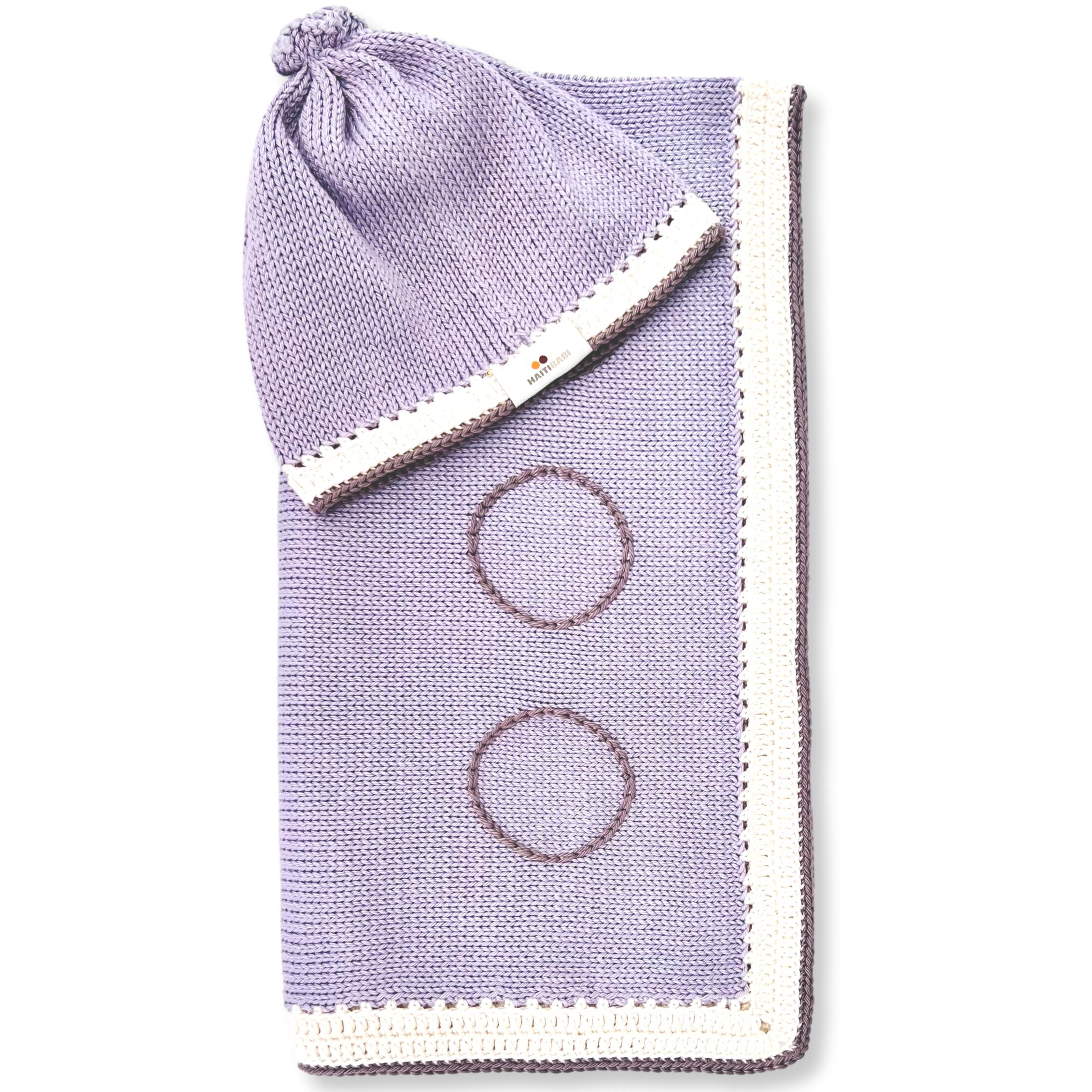 Get ready for cooler days with our Purple Ic Baby Blanket and adorable Beanie Set, beautifully accented with a Natural Shell Border and Suede Trim. Soft, breathable, and machine washable, this set is perfect for keeping baby warm and cozy — without overheating.