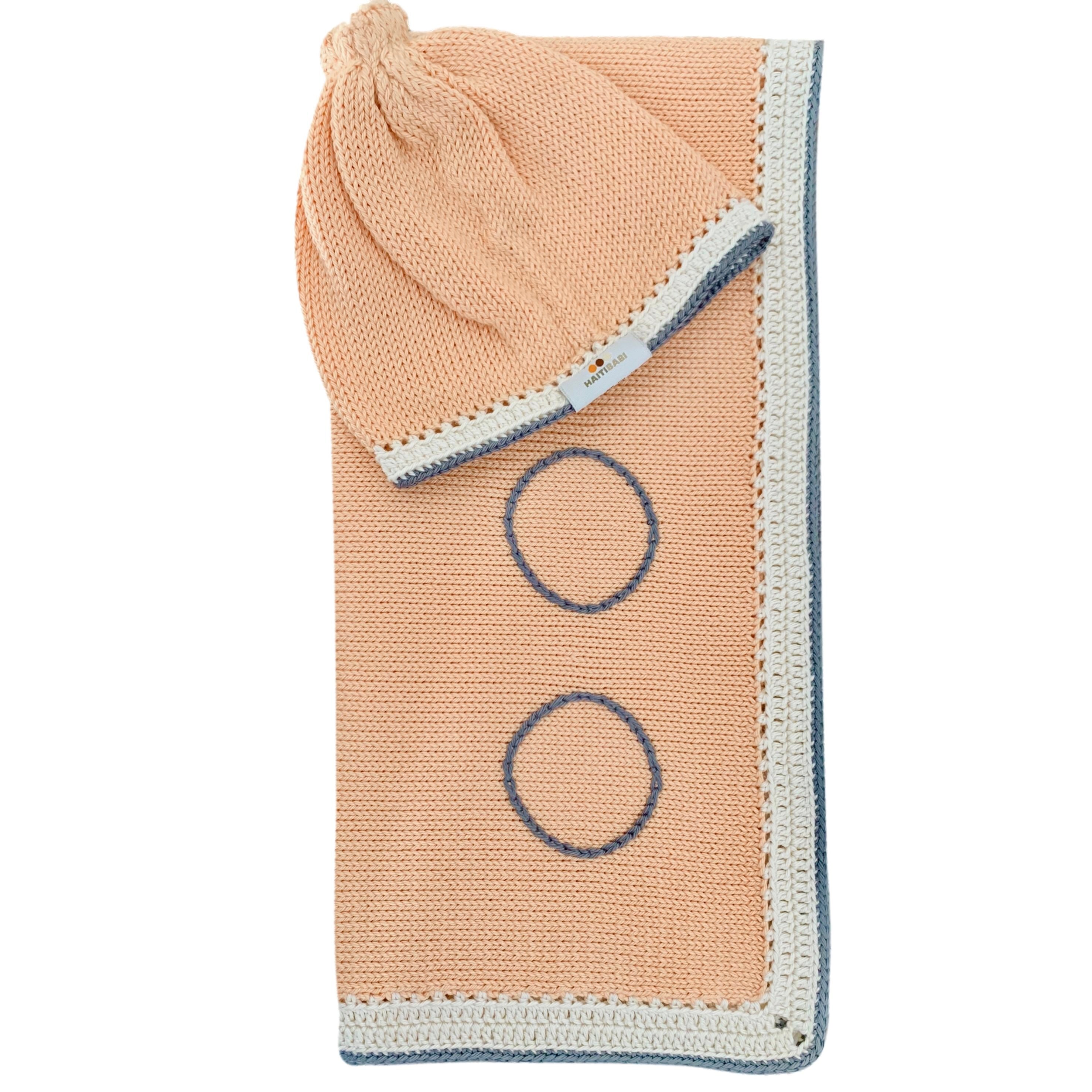 Get ready for cooler days with our White Peach Baby Blanket and Beanie Set, beautifully accented with a Natural Shell Border and Stone Gray Trim. Soft, breathable, and machine washable, this set is perfect for keeping baby warm and cozy — without overheating.